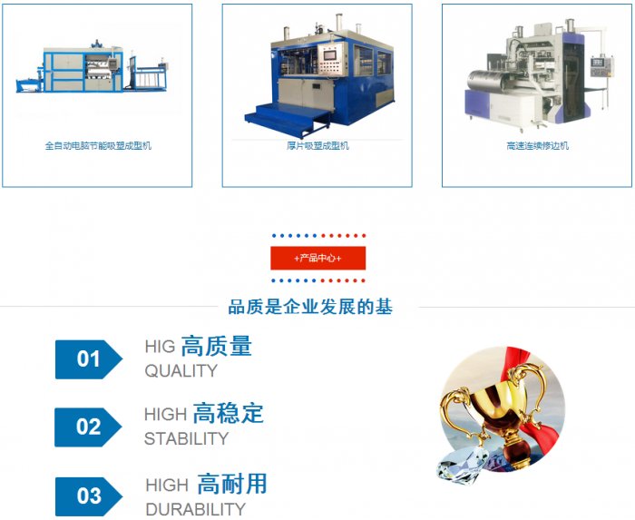 香廣機(jī)械,致力于成為中國(guó)最專業(yè)的塑料熱成型設(shè)備供應(yīng)商。2005年在上海創(chuàng)立至今,一貫遵從“誠(chéng)信、務(wù)實(shí)、開拓、創(chuàng)新”這一經(jīng)營(yíng)理念,以高品質(zhì)的追求,贏得顧客與市場(chǎng)的青睞。主要產(chǎn)品包括:全自動(dòng)正負(fù)壓成型機(jī)生產(chǎn)線、全自動(dòng)負(fù)壓裁切一體生產(chǎn)線、全自動(dòng)吸塑成型機(jī)系列、厚片吸塑成型機(jī)系列、材料擠出生產(chǎn)線系列、一次性制杯設(shè)備生產(chǎn)線、高周波塑膠熔接機(jī)系列、超聲波塑膠熔接機(jī)系列、精密四柱油壓裁斷機(jī)系列等。