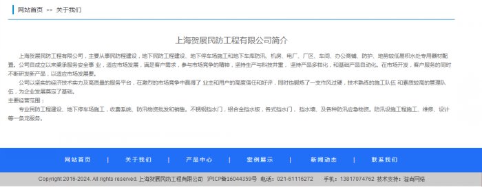 上海賀展民防工程有限公司,主要從事民防程建設(shè),地下民防工程建設(shè)、地下停車場(chǎng)施工和地下車庫防汛、機(jī)房、電廠、廠區(qū)、車間、辦公商鋪、防護(hù)、地勢(shì)較低易積水處專用器材配置。公司自成立以來秉承服務(wù)安全事 業(yè),適應(yīng)市場(chǎng)發(fā)展,滿足客戶需求,參與市場(chǎng)競(jìng)爭的精神,堅(jiān)持生產(chǎn)與科技并重, 堅(jiān)持產(chǎn)品多樣化,和基礎(chǔ)產(chǎn)品自動(dòng)化。在市場(chǎng)開發(fā),客戶服務(wù)的同時(shí)不斷研發(fā)新產(chǎn)品,以適應(yīng)市場(chǎng)發(fā)展需要。