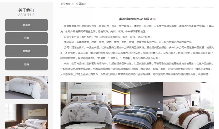 南通愛麗盟紡織品有限公司是一家集研發(fā)、設(shè)計、生產(chǎn)銷售為一體的多元化公司。專業(yè)生產(chǎn)高星級賓館、酒店紡織品配套用品有近十年歷史,公司產(chǎn)品銷售網(wǎng)絡(luò)覆蓋全國,遠(yuǎn)銷歐洲、美洲、非洲、中東等國家和地區(qū)。公司主要產(chǎn)品:面料系列,40S-120S高織高密緞紋、緞條、段格、提花平紋等,成品系列,主要有被套、枕套、床單、被芯、枕芯、床墊、床裙、床尾巾等系列產(chǎn)品,以及餐飲布草毛巾浴衣類產(chǎn)品。
