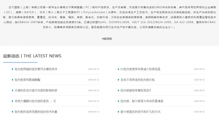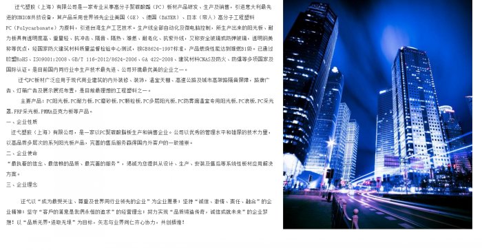 迂弋塑膠(上海)有限公司是一家專業(yè)從事高分子聚碳酸酯(PC)板材產(chǎn)品研發(fā)、生產(chǎn)及銷售,引進意大利最先進的UNION共擠設備,其產(chǎn)品采用世界領先企業(yè)美國(GE)、德國(BAYER)、日本(帝人)高分子工程塑料PC(Polycarbonate)為原料,引進臺灣生產(chǎn)工藝技術(shù)。生產(chǎn)線全部自動化及微電腦控制,所生產(chǎn)出來的陽光板、耐力板具有透明度高、重量輕、抗沖擊、隔音、隔熱、難燃、耐老化、抗紫外線,又稱安全玻璃或防彈玻璃,透明鋼美稱等優(yōu)點,經(jīng)國家防火建筑材料質(zhì)量監(jiān)督檢驗中心測試,按GB8624-1997標準,產(chǎn)品燃燒性能達到難燃B1級。已通過歐盟RoHS、ISO9001:2008、GB/T 116-2012/8624-2006、GA 422-2008、建筑材料CNAS及防火、防爆等多項國家及國際認證。是目前國內(nèi)同行業(yè)中生產(chǎn)技術(shù)最先進、公司環(huán)境最優(yōu)美的企業(yè)之一。