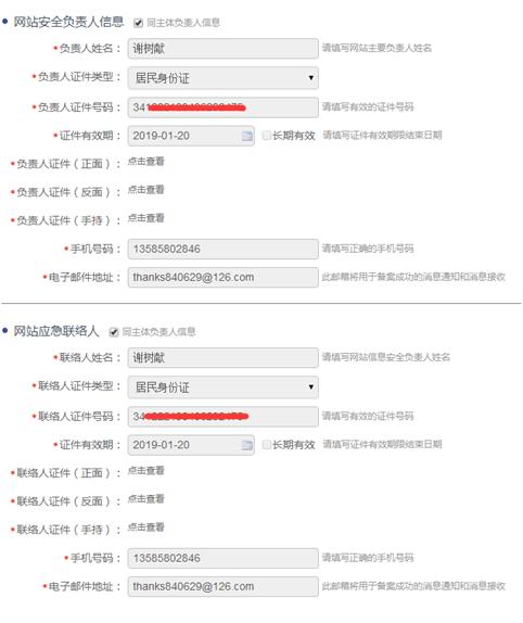這個可以直接選擇 “同主體負責(zé)人信息”或者另外填寫,都可以。