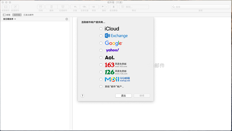 上圖中勾選最后一個(gè)‘其他郵件帳戶’選項(xiàng),點(diǎn)擊“繼續(xù)”按鈕。
