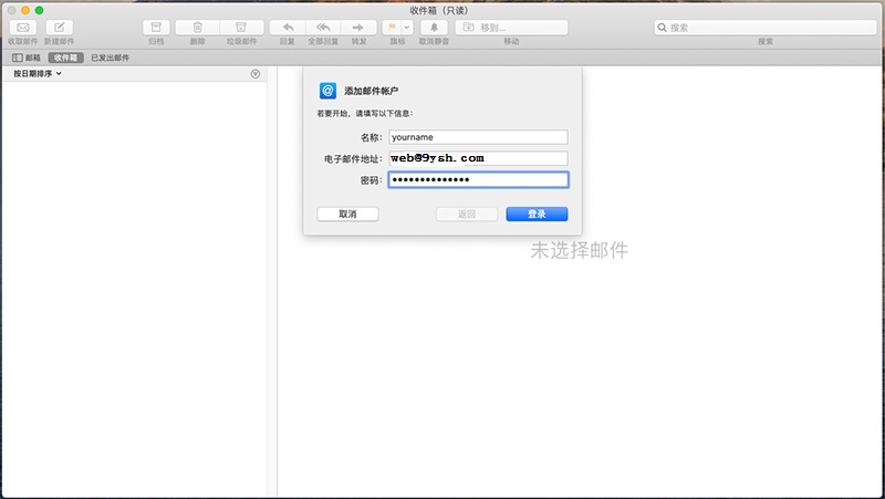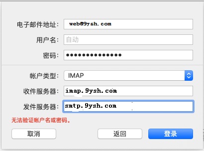 在上圖彈出框中,填寫您的名稱(沒(méi)有特殊限制,您可以隨意填寫),電子郵件地址和對(duì)應(yīng)的密碼。上圖以web@9ysh.com為例,您應(yīng)該填寫您自己的郵件地址。完成后點(diǎn)擊“登錄”按鈕。