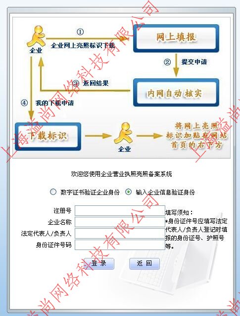 點(diǎn)擊“企業(yè)網(wǎng)上亮照標(biāo)識下載”模塊,輸入“用戶名”和“密碼”進(jìn)行登錄(首次登錄的用戶須先進(jìn)行注冊),進(jìn)入“企業(yè)營業(yè)執(zhí)照亮照備案系統(tǒng)”頁面,輸入企業(yè)信息(企業(yè)標(biāo)識、注冊號、企業(yè)名稱、法定代表人/負(fù)責(zé)人、證件號)驗(yàn)證身份。已經(jīng)領(lǐng)取數(shù)字證書(營業(yè)執(zhí)照電子副本)的企業(yè),可直接用數(shù)字證書驗(yàn)證企業(yè)身份。