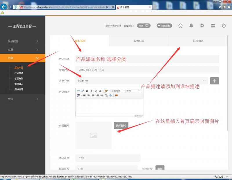 6. 添加產(chǎn)品:點(diǎn)擊添加產(chǎn)品,輸入產(chǎn)品名稱,選擇產(chǎn)品分類,點(diǎn)擊產(chǎn)品圖片,插入首頁展示封面圖片,最后輸入產(chǎn)品內(nèi)容即可。