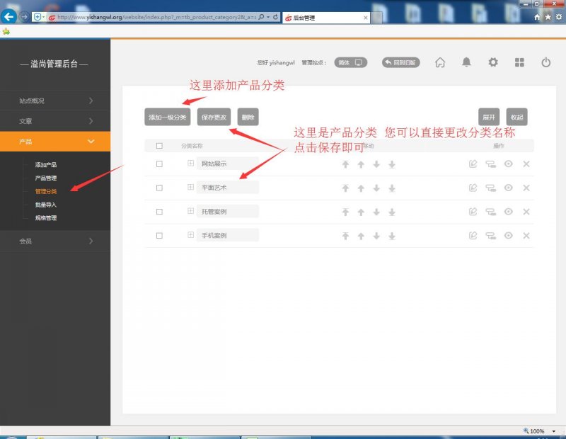 7. 修改分類添加分類:點(diǎn)擊管理分類,可以添加產(chǎn)品分類,也可以修改產(chǎn)品分類