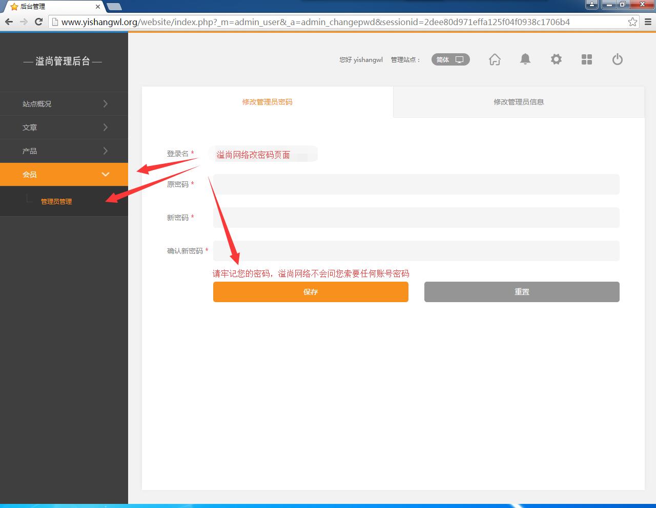 3.當(dāng)您第一次拿到后臺(tái)賬號(hào)密碼的時(shí)候,記得更改密碼以便保證您的網(wǎng)站后臺(tái)資料的安全以及保密度。溢尚網(wǎng)絡(luò)全體員工不會(huì)詢問您索要賬號(hào)以及密碼。