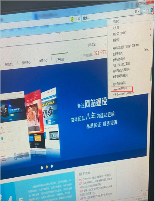 1、IE瀏覽器:點(diǎn)擊右上角工具圖案按鈕,選擇“Internet選項(xiàng)”,如下圖所示: