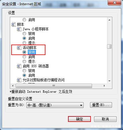 3、找到“活動(dòng)腳本”設(shè)置項(xiàng),將其更改成“禁用”,選擇“確定”按鈕,如下圖所示: